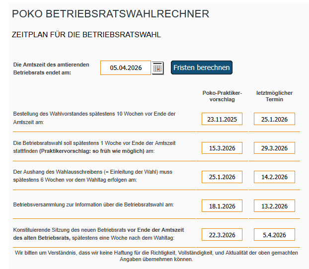Einfach das Ende der Amtszeit des amtierenden Betriebsrats eingeben und Sie sehen alle relevanten Fristen für eine fehlerfreie Betriebsratswahl übersichtlich auf einen Blick. Zum Fristenrechner